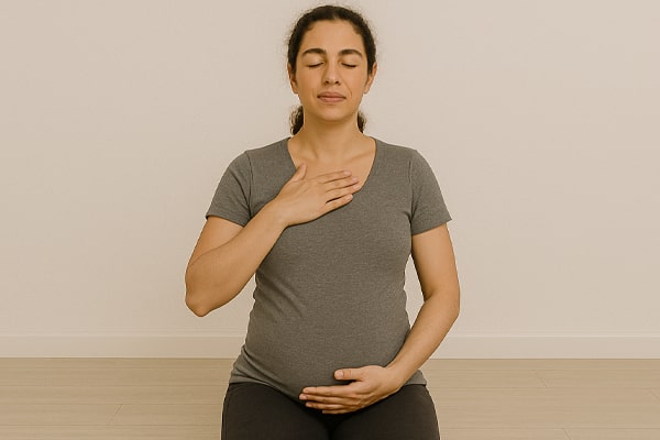 روی زمین یا صندلی راحت بنشینید. چشمانتان را ببندید و یک دست را روی شکم و دست دیگر را روی سینه قرار دهید. از بینی به آرامی نفس بکشید تا شکم بالا بیایید. سپس از دهان خارج نمایید. تمرین کاهش اضطراب و آماده سازی ذهن برای زایمان را سبب می شود. شما می توانید روزانه 15 الی 30 دقیقه این تمارین را به شرط عدم خستگی یا درد غیر عادی انجام دهید.