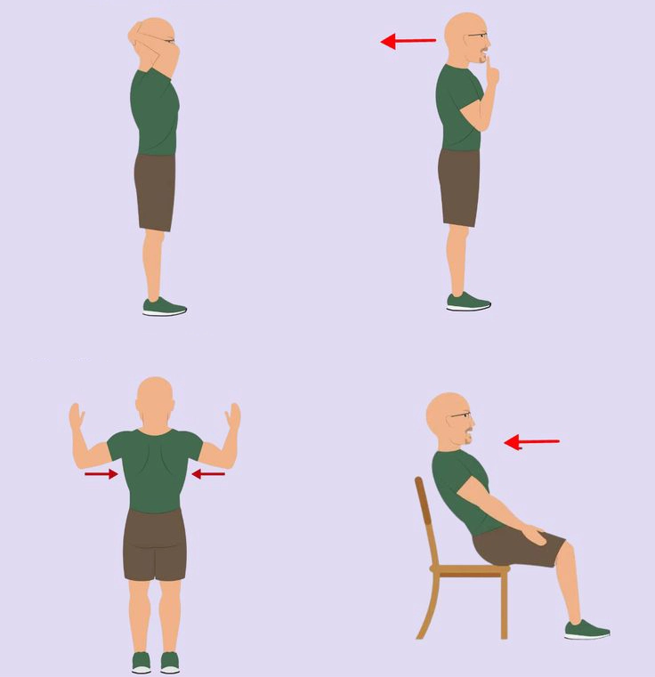 - حرکات کششی گردن: گردن خود را به آرامی جهت تقویت و انعطاف پذیری به جلو، عقب و طرفین خم نمایید.