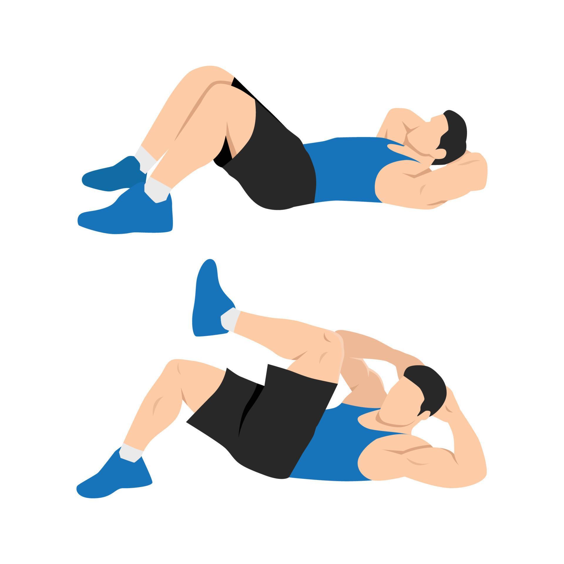 - برای انجام این تمرین، روی زمین دراز بکشید و دستان خود را پشت سرتان حلقه کنید. برای انجام این تمرین باید شانه ها را از زمین بلند کنید. زانو ها را خم کرده و به سمت بالا بیاورید. حال با دم و بازدم آرنج دست راست را به زانوی پای چپ برسانید و سپس همین حرکت را با دست و پای مخالف تکرار نمایید.