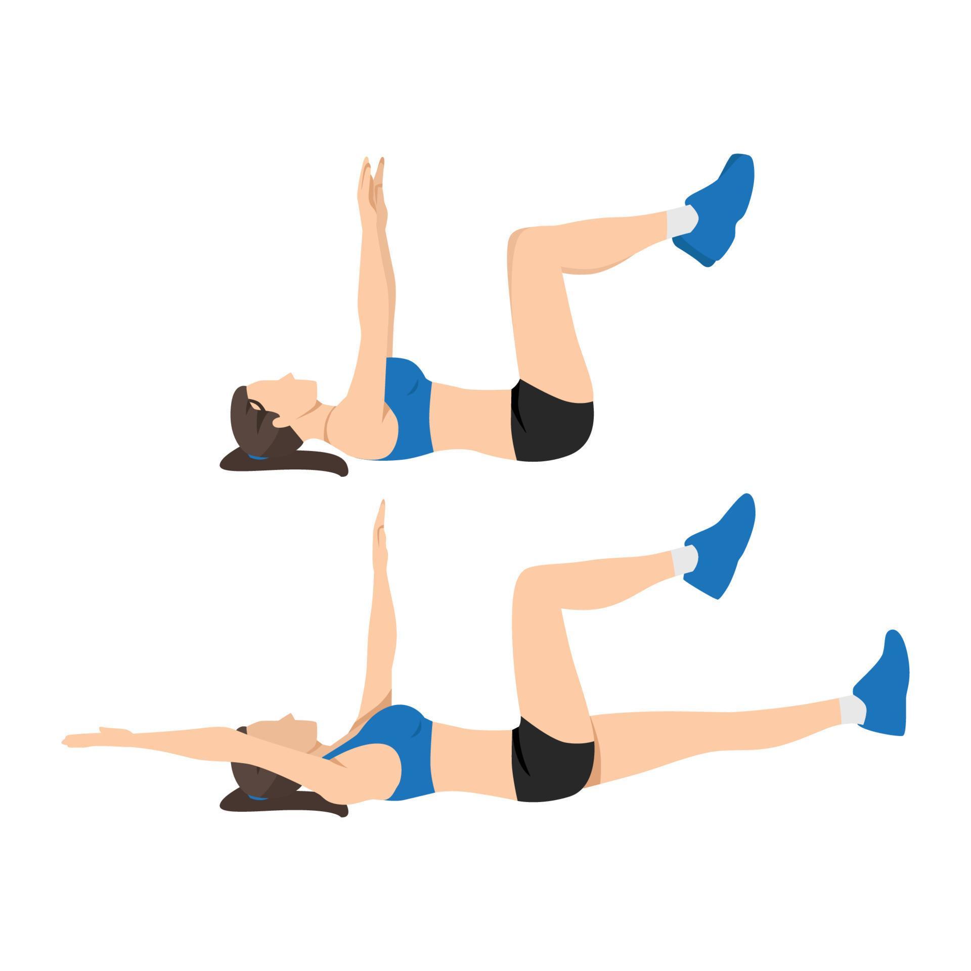 - به پشت دراز بکشید و زانو ها را خم کرده و به بالا بیاورید. به طوری که ران ها عمود بر زمین و ساق پا موازی با زمین باشد. دست ها را به بالا ببرید. حال، همزمان دست راست را به سمت عقب (زمین) برده و پای چپ را صاف کنید. به حالت اول برگردید و حرکت را با دست و پای مخالف انجام دهید.