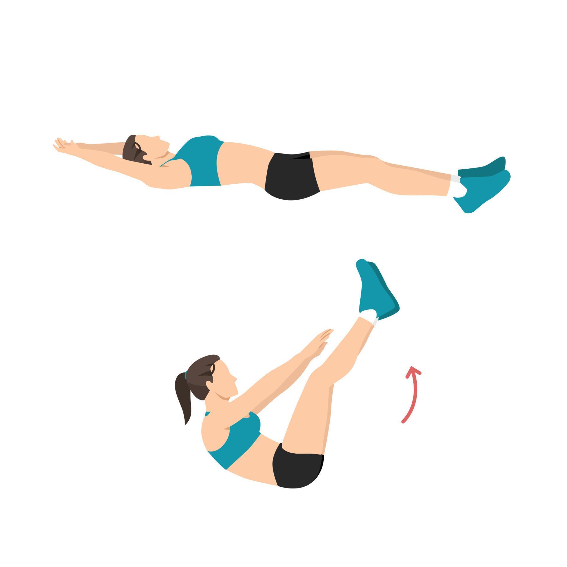 - به پشت روی زمین بخوابید. دست ها را صاف و کشیده به بالای سر ببرید. پاها را در حالی که صاف و کشیده هستند از زمین بلند کنید. بالا تنه را نیز از زمین بلند کرده و دست ها را جلو بیاورید به طوری که به انگشتان پا نزدیک شود. در این حالت بدن شکل V به خود می گیرد. سپس آرام به حالت خوابیده برگردید.