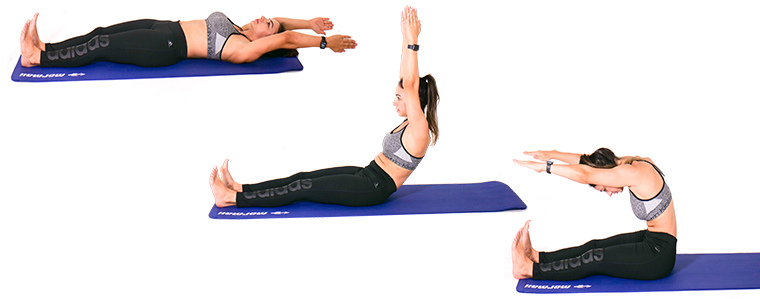 - شیوه اجرا : این حرکت جایگزین حرفه ای تر دراز نشست های سنتی است. به پشت دراز بکشید و دست ها را بالا ببرید. با کنترل کامل، بالاتنه را بالا بیاورید و دوباره بازگردید.