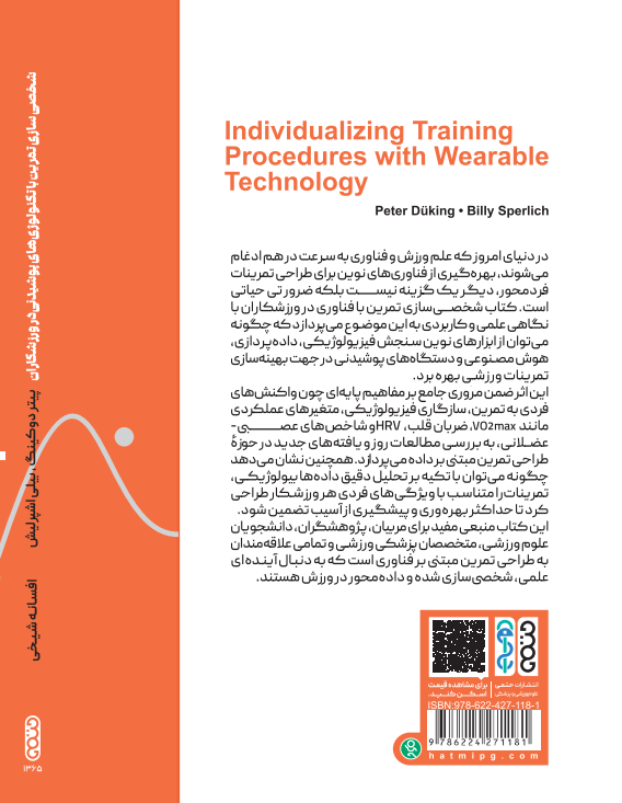 کتاب شخصیسازی تمرین با تکنولوژیهای پوشیدنی در ورزشکاران اثر پیتر دوکینگ و بیلی اشپرلیش، یک منبع علمی و عملی جامع در حوزه تمرینات ورزشی مبتنی بر داده و فناوری پوشیدنی است. این کتاب به بررسی چگونگی استفاده از دادههای جمعآوریشده توسط ابزارهای پوشیدنی مانند ساعتهای هوشمند، حسگرهای ضربان قلب و سنسورهای حرکتی میپردازد تا تمرینات ورزشی دقیق و متناسب با ویژگیهای فردی هر ورزشکار طراحی شود.
