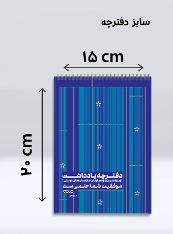 - سایز کاربردی و مناسب: این دفترچه در سایز استاندارد 20 × 15 سانتیمتر طراحی شده است که فضای کافی برای ثبت برنامهها، دستورجلسات و یادداشتهای روزانه را فراهم میکند.